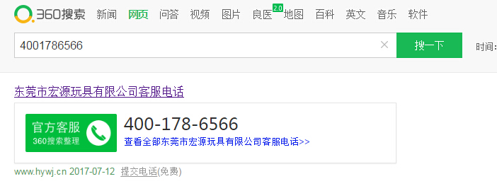 祝賀宏源玩具客服電話通過360搜索審核。...